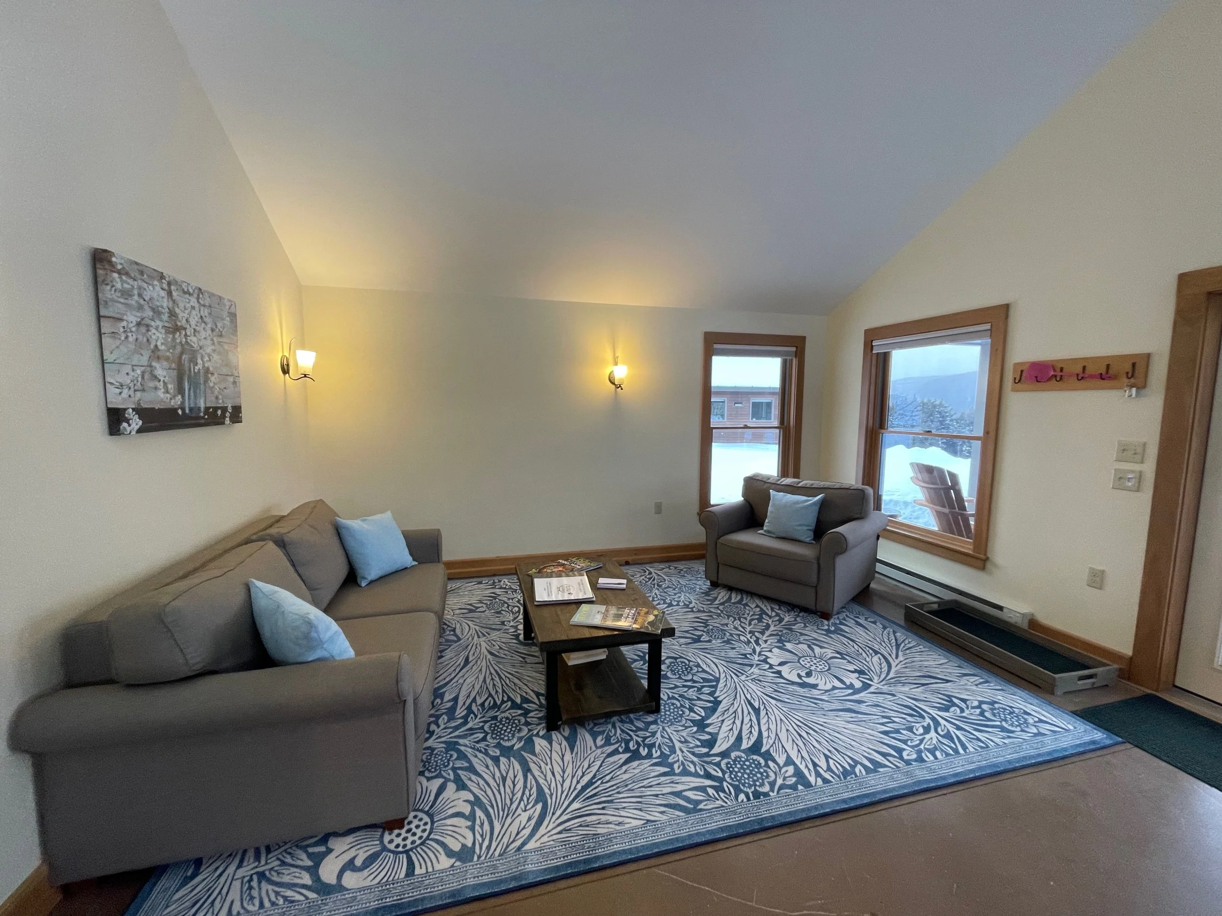 Ascutney Cabin is great for couples or families with small children. This is a PET FRIENDLY cabin. The cabin is about 660 sq feet. It has a fully equipped kitchen, a private bathroom with a tub/ shower combo, a comfortable size bedroom with a queen bed, and a sofa sleeper in the living area that has a queen mattress. Enjoy your breakfast of farm fresh eggs while sitting in your little breakfast nook and stare out the big windows at the beautiful views.