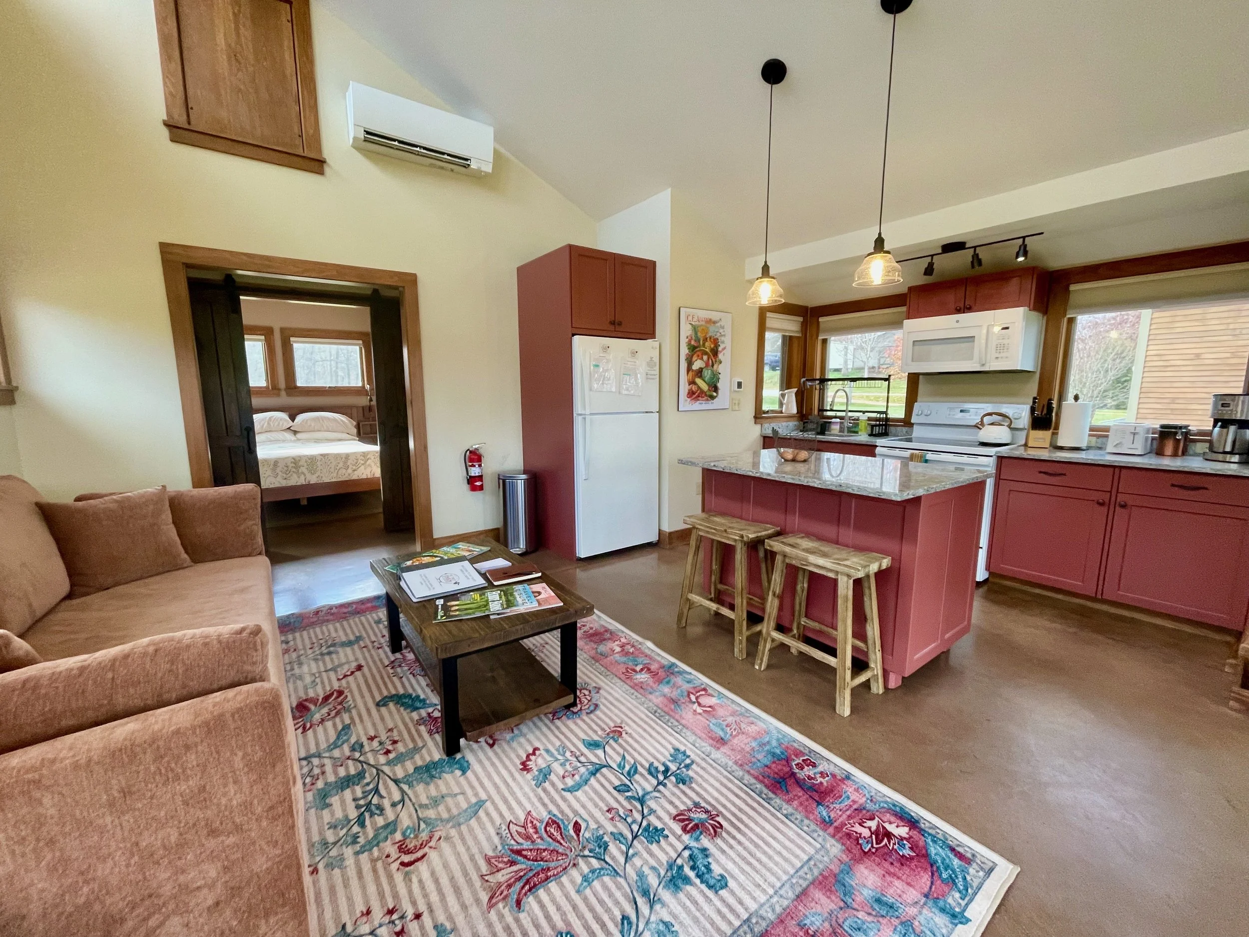 Sunrise Cabin is warm and welcoming. The cabin is about 500 sq feet. It is perfect for couples or couples with small children. It is also one of our PET FRIENDLY cabins. The living area includes a fully equipped kitchen and a comfy futon that can be pulled out into a full mattress. Rustic barn doors open to a small bedroom with a queen bed. The bathroom has a tub/ shower combination. Set your alarm and wake up for the most amazing sunrise or sleep in in our comfy beds and take our word for it about the sunrises. ;-)